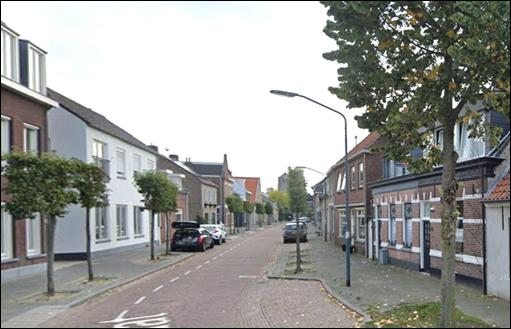 linkerzijde ongeveer waar de toren te zien is. Links de boom vol bladerloof