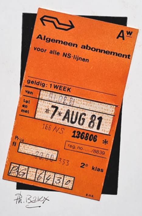 schilderijen afgebeeld stond, waaronder in zwart-wit ook mijn treinkaart. Ik