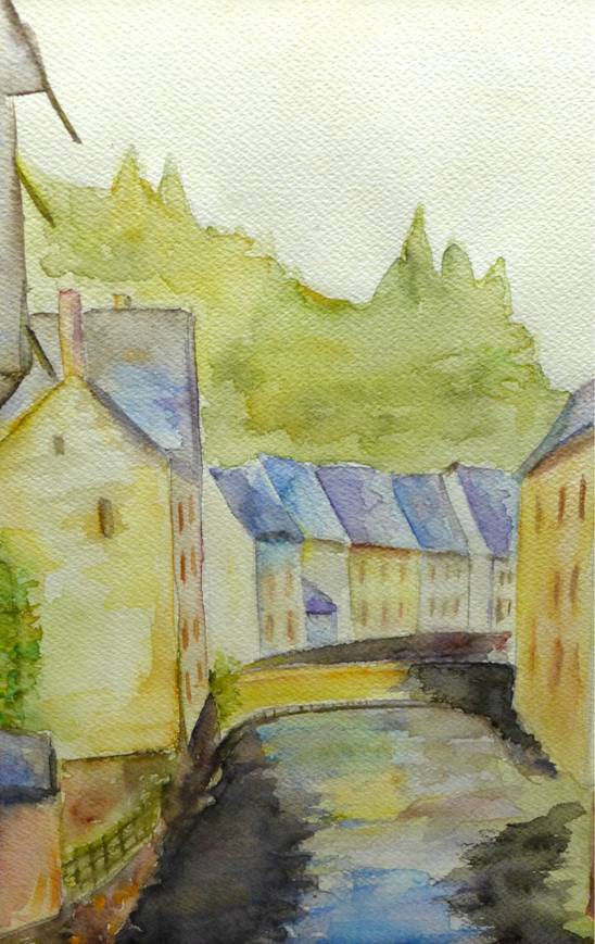 «Rivier de Rur stromend door Monschau» - Tom Bakx – aquarel op aquarelpapier 34 x 24 cm – Boxtel, 1985