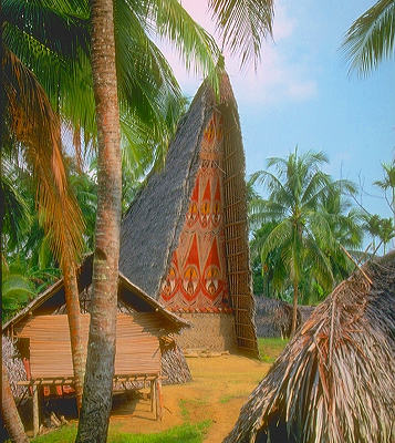"haus tamberan", geestenhuis van de Abelam, Niugini Om enigszins de monotonie van de ceremoniële inwijdingen bij de Abelam te doorbreken, waarbij we voor de radio in het geheel niets te zien krijgen van de prachtig beschilderde mannengezichten of de grote kleurrijke hoofdtooien, kiezen wij er ook voor om andersoortige klankopnamen uit de gevulde reistas van Robert MacLennan aan bod te laten komen. Zo is daar de vermaarde binatang-opname van Papua-man Mahisu - (van de Wam-stam) die een kleine levende sago-kever aan een palmbladnerf heeft geprikt, en vervolgens uit de gekwelde zoemtoon van het diertje vóór zijn geopende mondholte boventoonmuziek creëert (foto hieronder). Dan nog klinken er holle-boommuziek van de Iatmul en een unieke solo van Menabepf op een houten ratelmondharp van 40 cm lengte. Hij is stamlid van de Oksapmin. Niet afkomstig uit de collectie van Robert MacLennan, maar van de Franse geluidsjager Charles Duvelle, horen we opnamen van de Yugu-Huli uit Hedemari in de Southern Highlands van Niugini. Van hen kunnen we mondboog, fluit, falsetto-zang horen en tot besluit van dit radioprogramma ook hun parmantige boodschapkreten galmend door het gebergte. Een tip: Wie weten wil over hoe het leven ongeveer staat in Papua Niugini, kan daarmee kennismaken via Jasja Rogier Arian, die het volgende boekje schreef: Papoea Nieuw Guinea: bedreigd paradijs U kunt het boekje bestellen door zelf met de auteur contact te leggen. of per gewone post: Herbert Hooverlaan 127, B-1030 - Brussel - België |